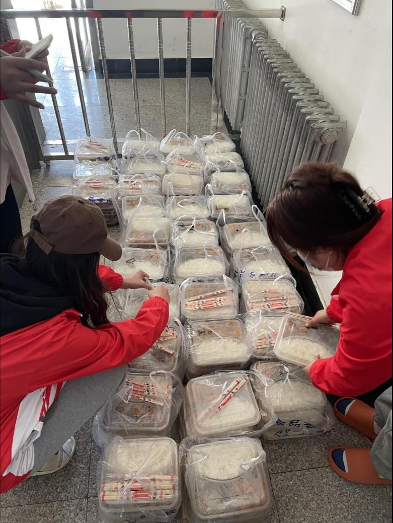 由于疫情防控,同学们处于居寝隔离状态,老师们与志愿者们主动请缨,为大家送餐。送餐是每天用时最长的工作,一日三餐一份份送到学生宿舍门口,为了能让大家吃上一口热乎饭,哪怕腿软了,衣服湿透了,他们也不敢休息,一送就是一个多小时,牺牲了自己吃饭与休息的时间,始终都没有一句怨言。