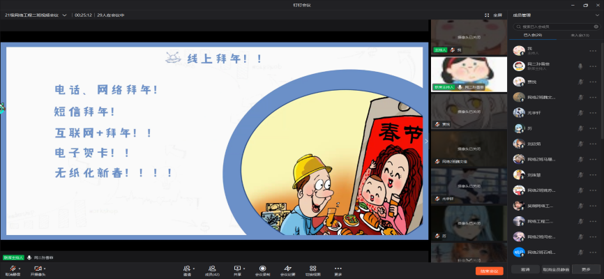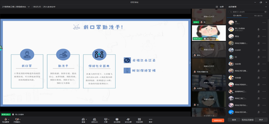 我院开展疫情安全自护教育活动,通过开展线上安全教育会议的形式,宣传禁燃禁放烟花爆竹,提倡电话、网络拜年,减少人员聚集。发扬戴口罩、勤洗手、保持社交距离、使用公勺公筷等卫生习惯,为亲朋好友普及疫情防控知识。