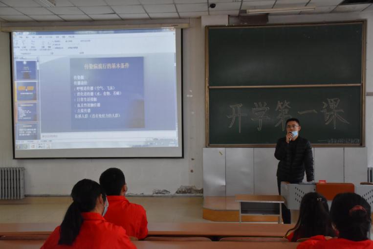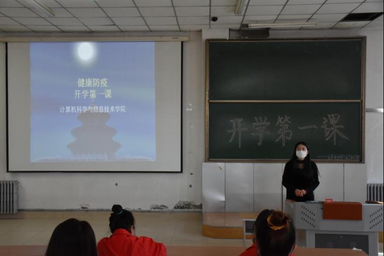 学生党支部书记张宇、2019级辅导员李海波、2020级辅导员老师苏鸿鹏为同学们开启新学期第一课,号召同学们认真学习,争取在新学期的补缓考、期末考试中取得理想成绩。三位老师强调了疫情常态化预防工作,预防春季传染病的措施,随后张宇老师从口罩的正确佩戴、用后处理,到日常的教室、宿舍通风,消毒等方面进行详细讲解,三位老师号召计科学子要做有大格局大智慧的新一代大学生,从点滴做起,养成良好习惯,有行动热情,有安全意识,有向上精神,有远大理想。同时也要注重个人安全,做好安全防护。