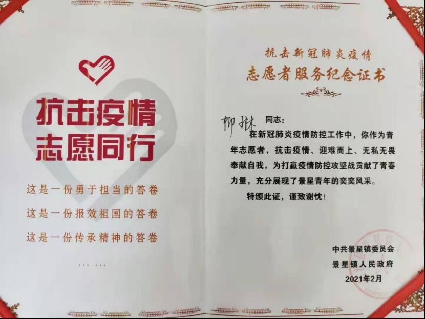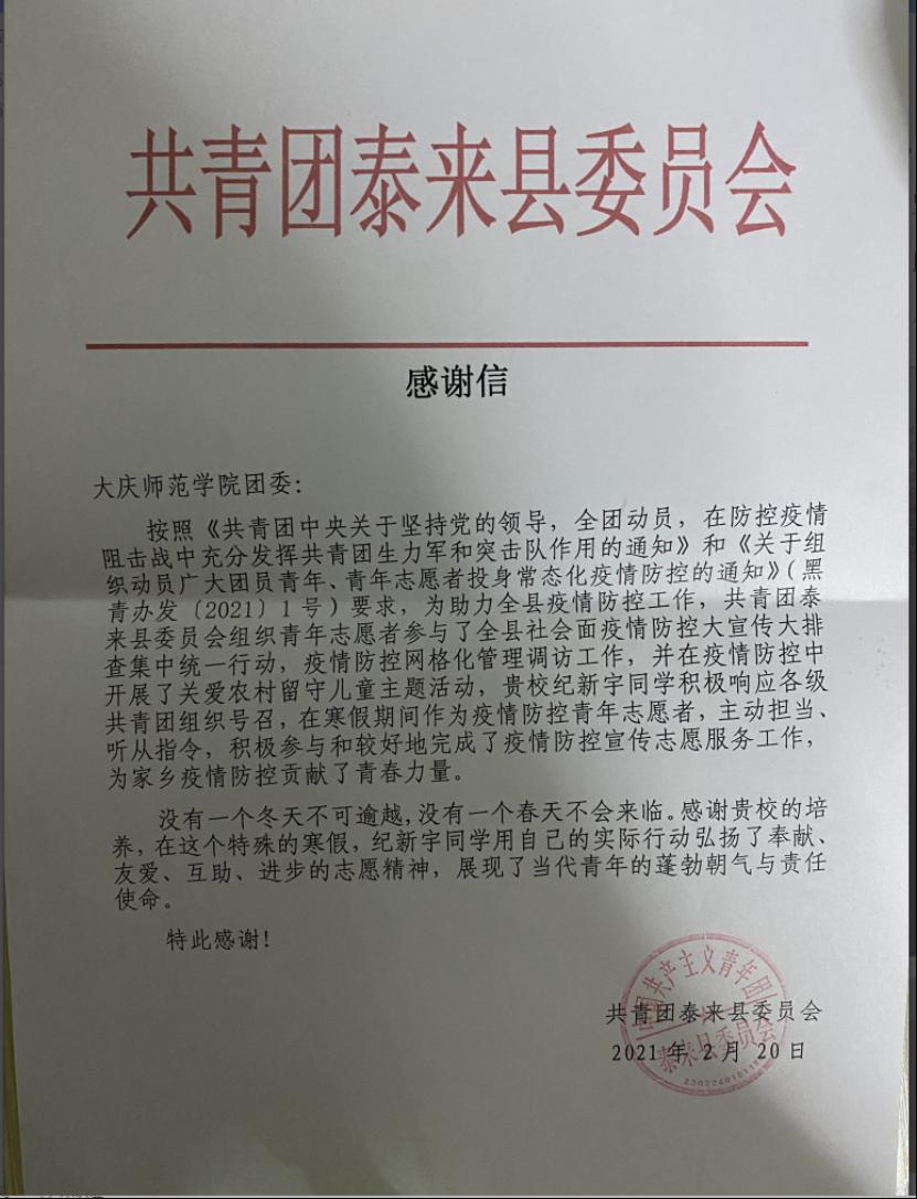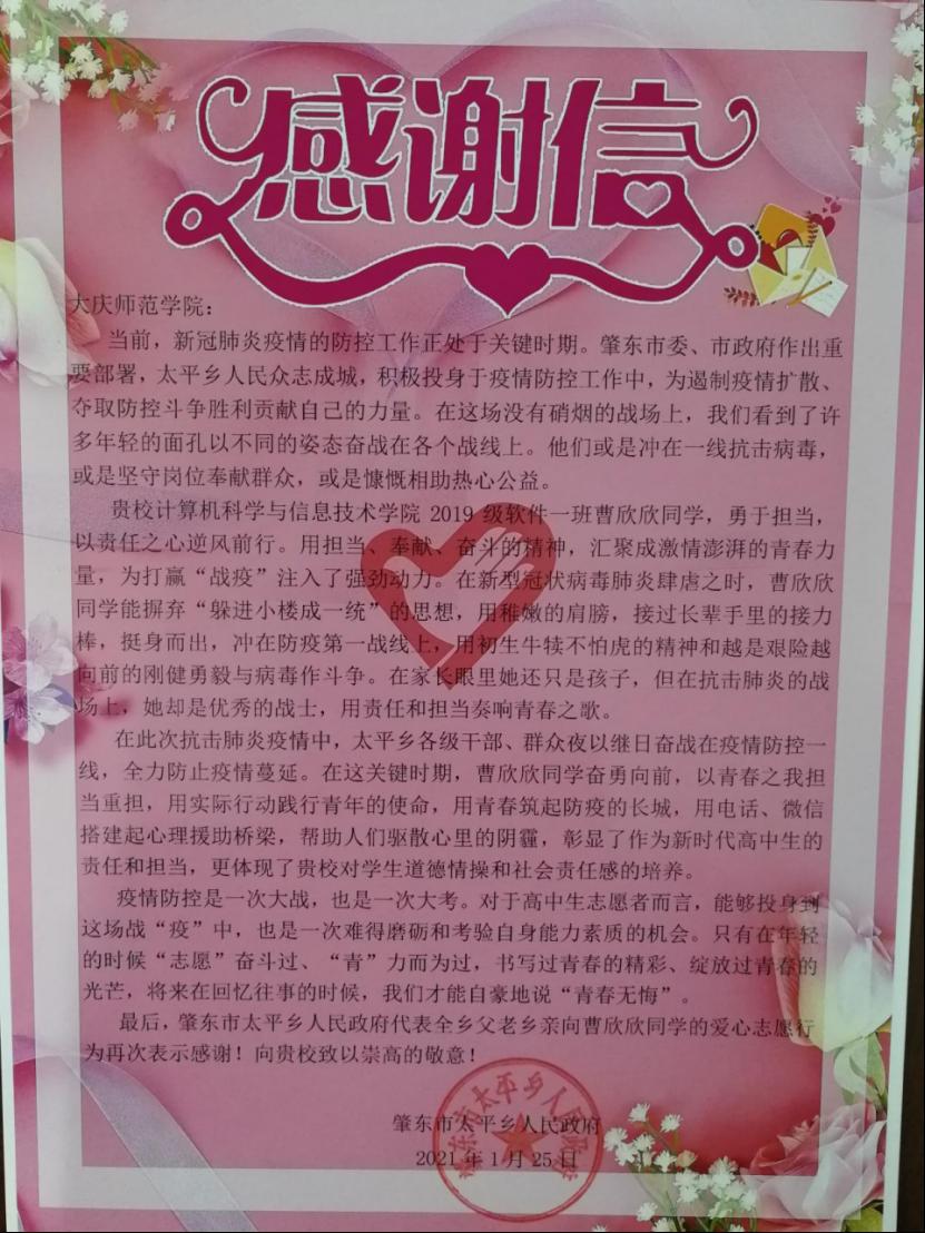 志愿者们在冬季的寒风中志愿担起了抗疫重任。他们忍受寒风肆虐,不舍昼夜坚守在疫情防控卡点;他们积极宣传防疫知识,指导群众做好防护工作;他们守望相助,热心帮助大家购买生活用品。一个个义无反顾的身影,一次次心手相连的接力,一幕幕感人至深的场景,生动展示了伟大抗疫精神。近日来,参与志愿活动的庆师计科学子陆续收到了来自家乡政府送来的感谢信,感谢他们一直以来的辛苦付出,感谢他们舍小家为大家,日以继夜奋战在防疫前线。