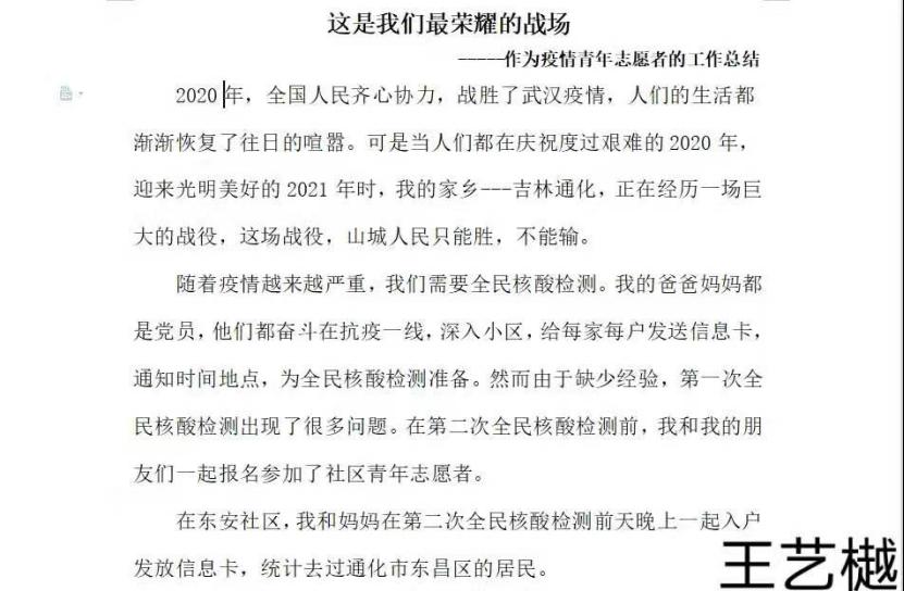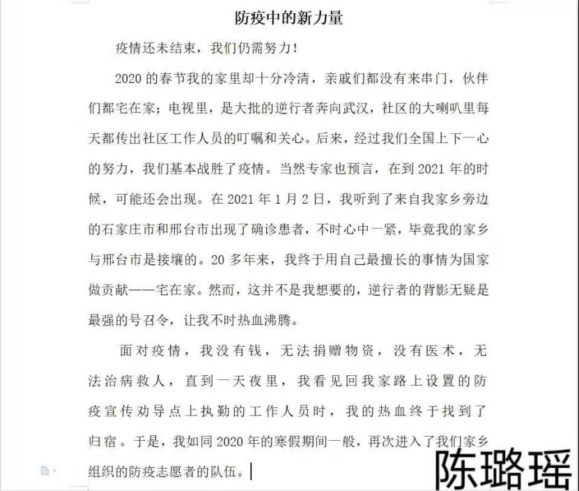 面对疫情严峻形势,我院65名学生,积极响应号召,主动请缨,参与到防控疫情中来,加入到防控疫情的志愿者队伍中,用实际行动诠释了自己的青春本色,为我院增光添彩。此次活动以投稿比赛形式借文章表达自己在此次疫情中志愿服务获得的感悟,参赛作品要求健康、积极向上、主题明确、内容丰富、有独到之处、感染力要强,抒发真情实感。此次活动同学们积极响应,纷纷来稿,充分的表达了自己的真情实感。经过微信小程序投票和专业老师评分。最终获奖人员名单如下一等奖:陈璐瑶,二等奖:王艺樾、杨鹏举,三等奖:武同庆、齐瑞雪、刘馨,优秀奖:于洋、曹欣欣、刘美宁、杨鑫月、武世宇。