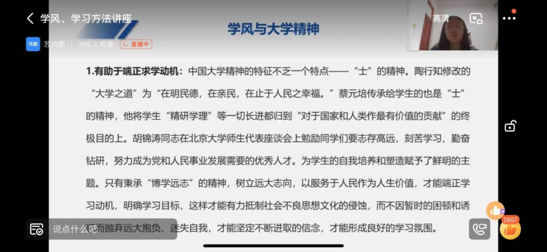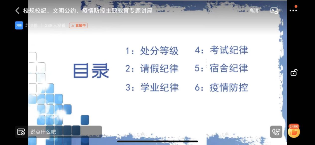 苏鸿鹏老师为新生详细地讲述了校规校纪,如处分等级的种类、违纪处理办法和时限、考勤管理中的学业纪律、学习年限、成绩考核与记载、学位授予、考试纪律、违纪认定与处理以及宿舍管理等方面,并强调了疫情防控下学校的相关规定,苏老师通过一系列的案例,警醒同学们一定要遵守校规校纪。