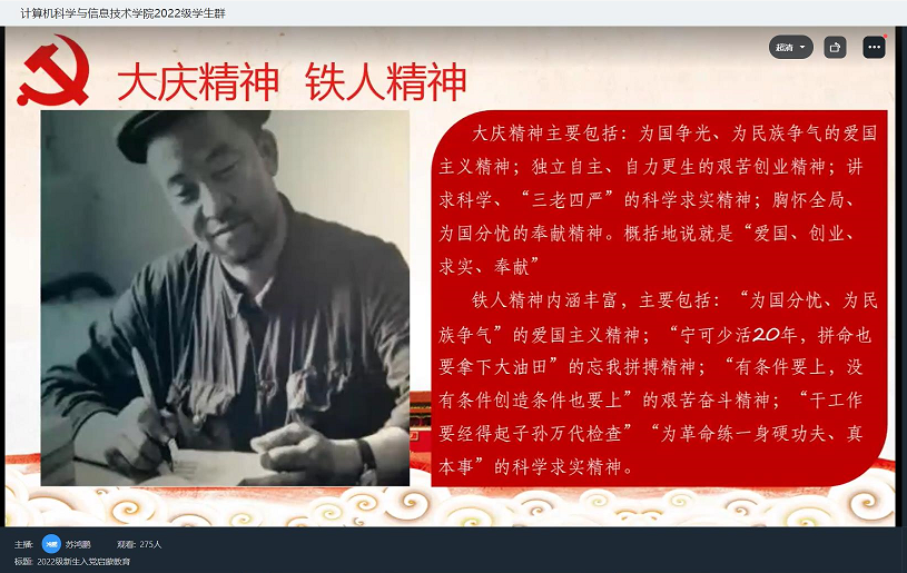 学习建党精神,铸造信仰之魂。为引领学生树立红色信仰,传承红色基因,会议讲述感动中国人物--航天人,时代楷模--钟南山院士,习近平总书记“七一”讲话和大庆精神的内涵,铁人王进喜等老一辈石油人的先进事迹,激励同学们在新的历史条件下,心怀梦想,牢记初心使命,勇于担当作为,以艰苦奋斗践行无悔青春!苏鸿鹏老师将理论与实际相结合,在课程中强调了端正入党动机的重要性和必要性,他希望同学们结合所学专业和自身实际不断深化对中国共产党的认识,积极了解当题教育的背景和内容,努力跟进学院党总支最新政治方向,积极向党组织靠拢。