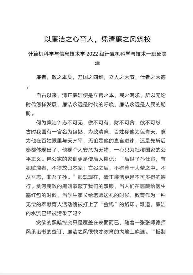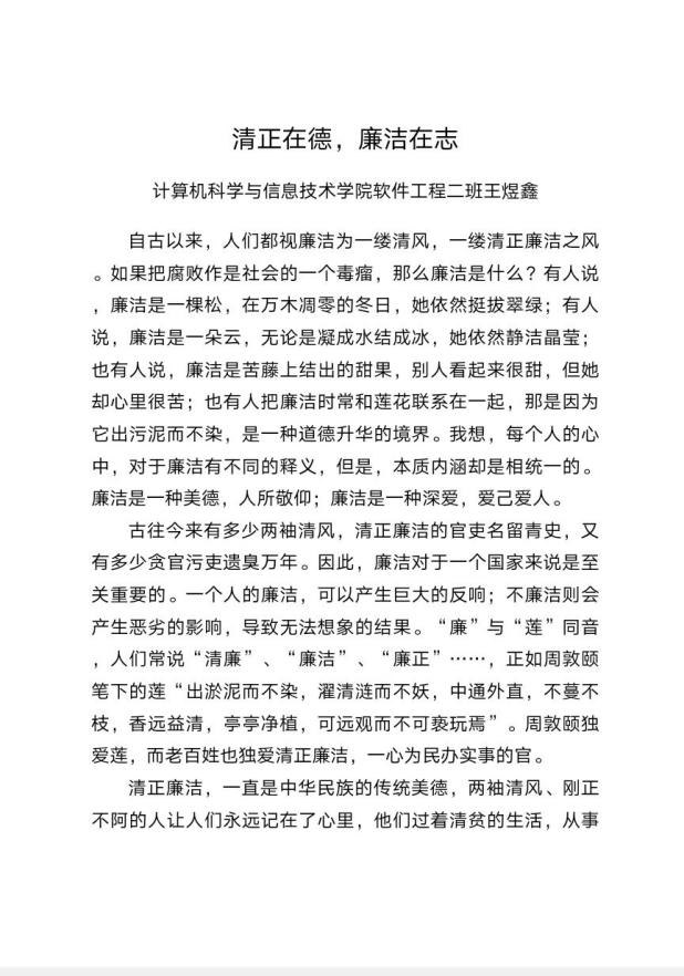 文以载道,言以传情。在召开主题班会和观看宣传片后,同学们对于廉洁文化有了更深刻的认识。万种思绪汇于笔尖倾泻出智慧的悬泉,廉洁泉水在同学们未来的人生路上汩汩不竭。下面让我们和同学们一起感悟廉洁吧!