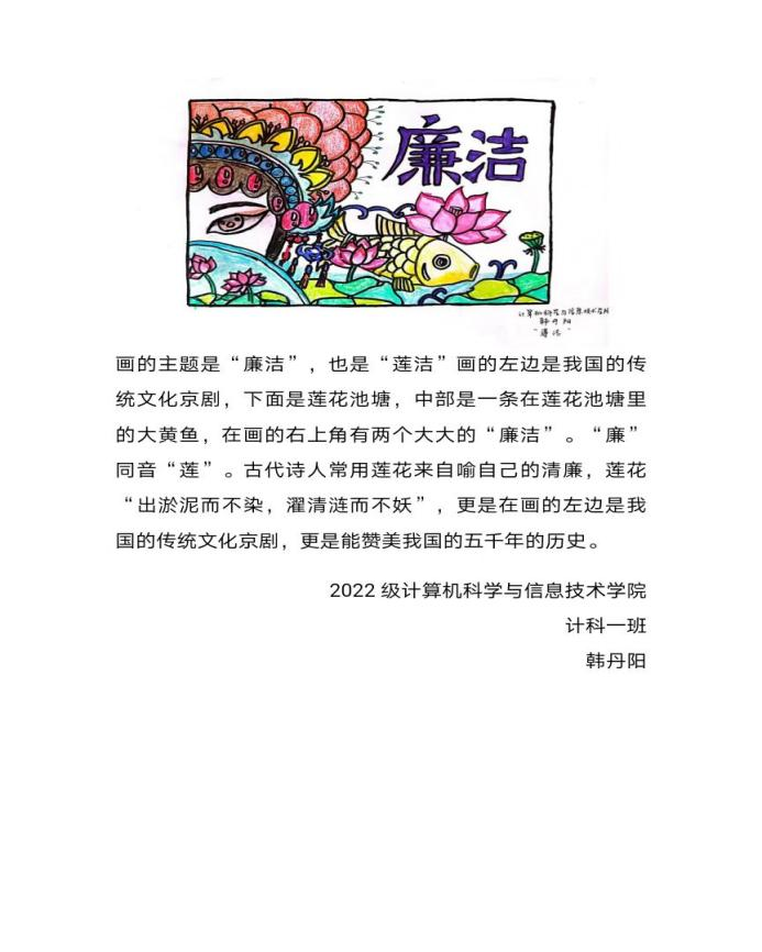 同学们积极参加与传统廉洁文化结合的校园活动,他们用自己手中的画笔诉说着他们对于廉洁的追求,点点笔墨,字字真情,廉洁二字如同濯濯莲花盛放在每一个同学的心间。同学们的创意思想与传统文化碰撞,激发了同学们对廉洁新的理解。下面让我们一起来欣赏同学们创作的海报吧!