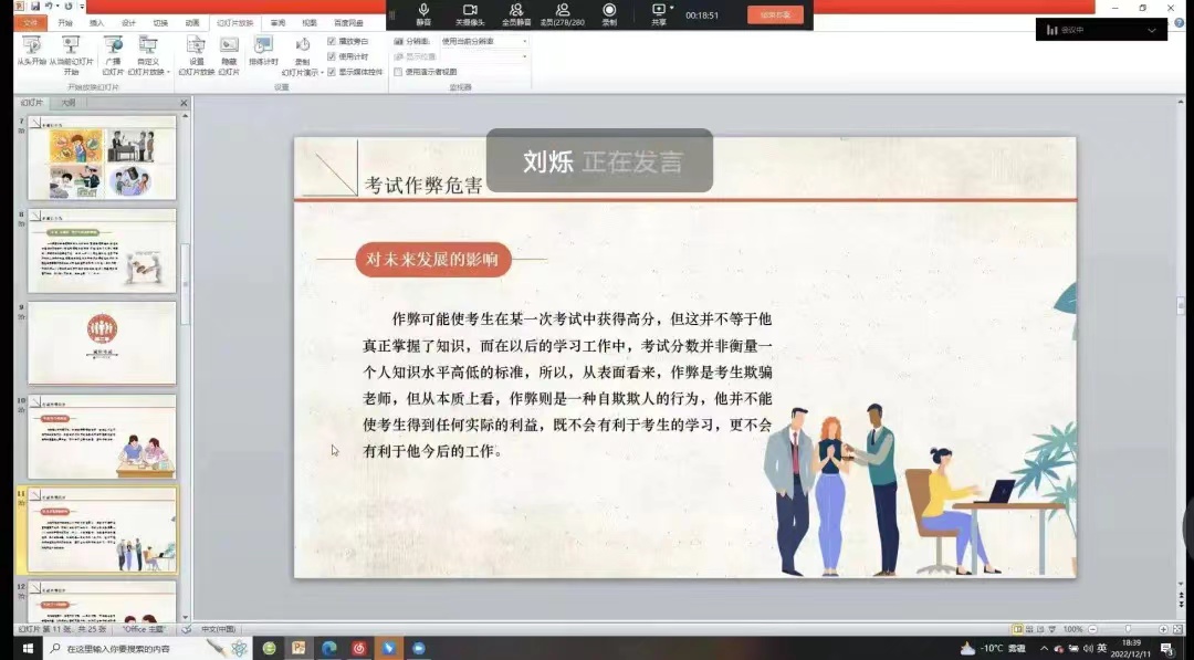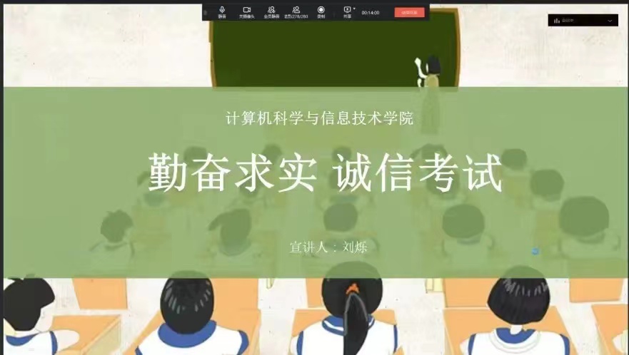 会上,刘烁老师向全体计科学子传达了学院严肃考风考纪的相关精神,阐述了考试规则以及相关规定,并围绕替考、抄袭等违纪行为进行了重点讲解。随后,老师又再次强调考试前需出示本人相关证件,全程不允许关闭摄像头等注意事项。