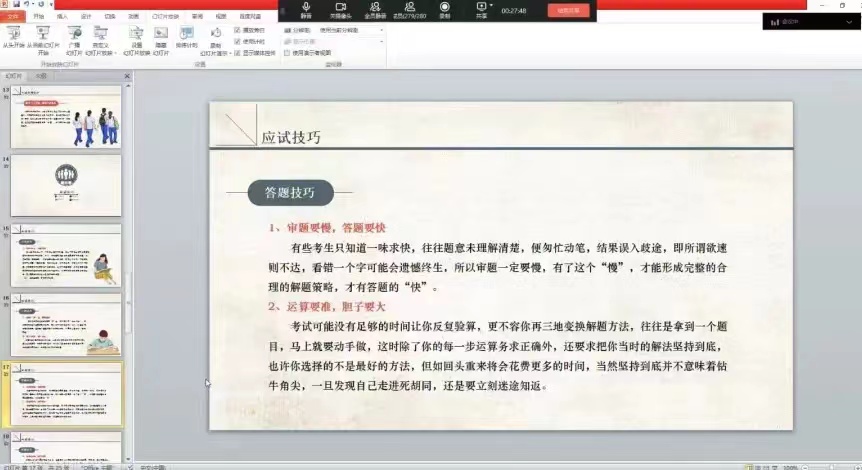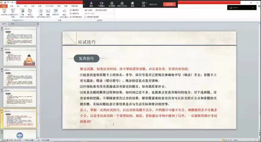 其次,老师向同学们传授了一些应试技巧,从心理、答题、思维、复查四个方面展开讲解,以此激励同学们以最好的一面面对考试。