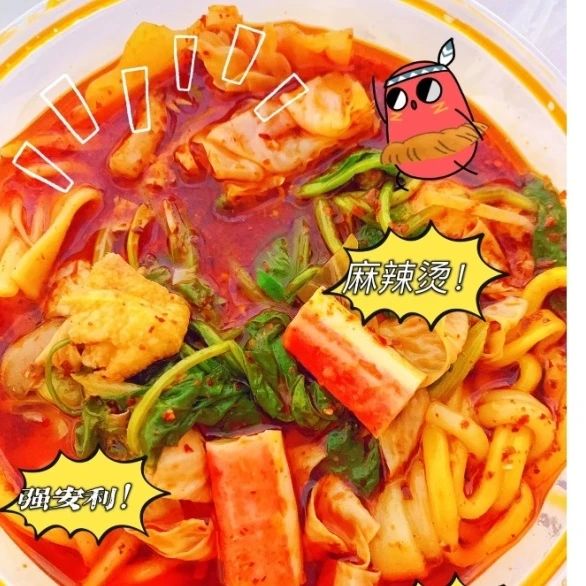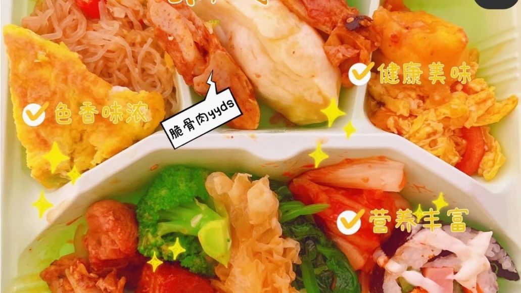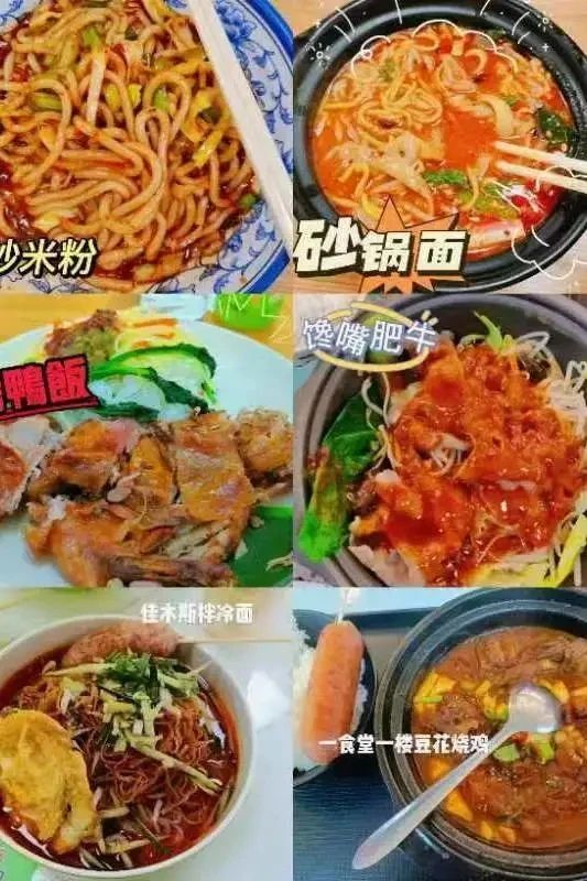土豆粉、肉蛋堡、米线、鸡腿饭、紫菜包饭、凉皮、肘子饭、鸡柳饭、水饺、烤饼、烤鱿鱼、板面、干锅菜花、水煮鱼、水煮肉片、寿司、拌饭、蛋糕、三明治、自选盒饭、炸鸡汉堡、奶茶、冰激淋、水果捞......