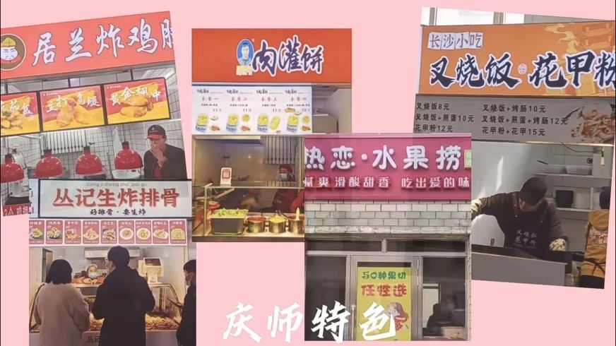 除食堂以外庆师还有特色小吃,供我们馋嘴星人享用,你想要的小吃它都有(煎、炸、煮、炒、烤、酸、甜、咸、辣、香)用食物填满你离家的不舍。