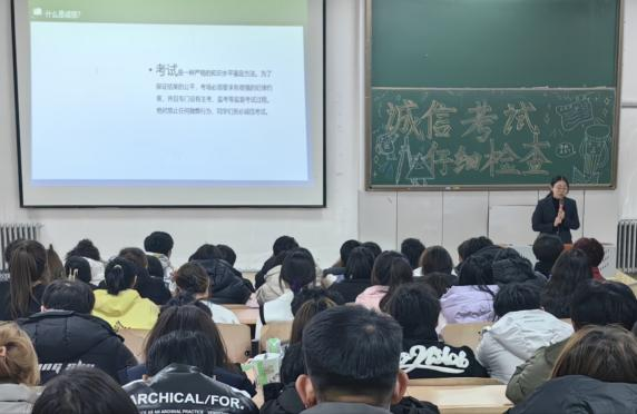 23级辅导员李欣航老师、李海波老师带领同学们做出对“诚信考试”的承诺:考试中严格遵守诚信原则,不抄袭,不作弊,自觉遵守考场纪律,全力以赴完成考试,以自己的真实水平展示自己真实的学习成果。最后对考试时间作出了具体要求:开考前20分钟考生持有关证件进入考场、开考15分钟后不准进入考点参加当次科目考试、交卷出场时间不得早于每课程考试结束前30分钟。