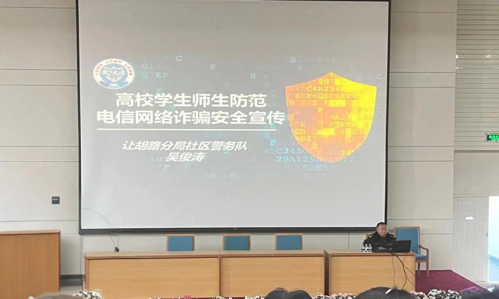 随着信息技术的快速发展,各种电信网络诈骗现象日益突出,而受骗对象也逐渐向低龄化蔓延,诈骗手段层出不穷、不断翻新。为了让学校师生树立反诈意识,增强自我保护的能力,3月13日下午,我院有幸参与学校组织的防范电信网络诈骗主题安全讲座。此次讲座由让胡路分局社区警务队吴俊涛警官以及校保卫处处长盖立庆参与主持。