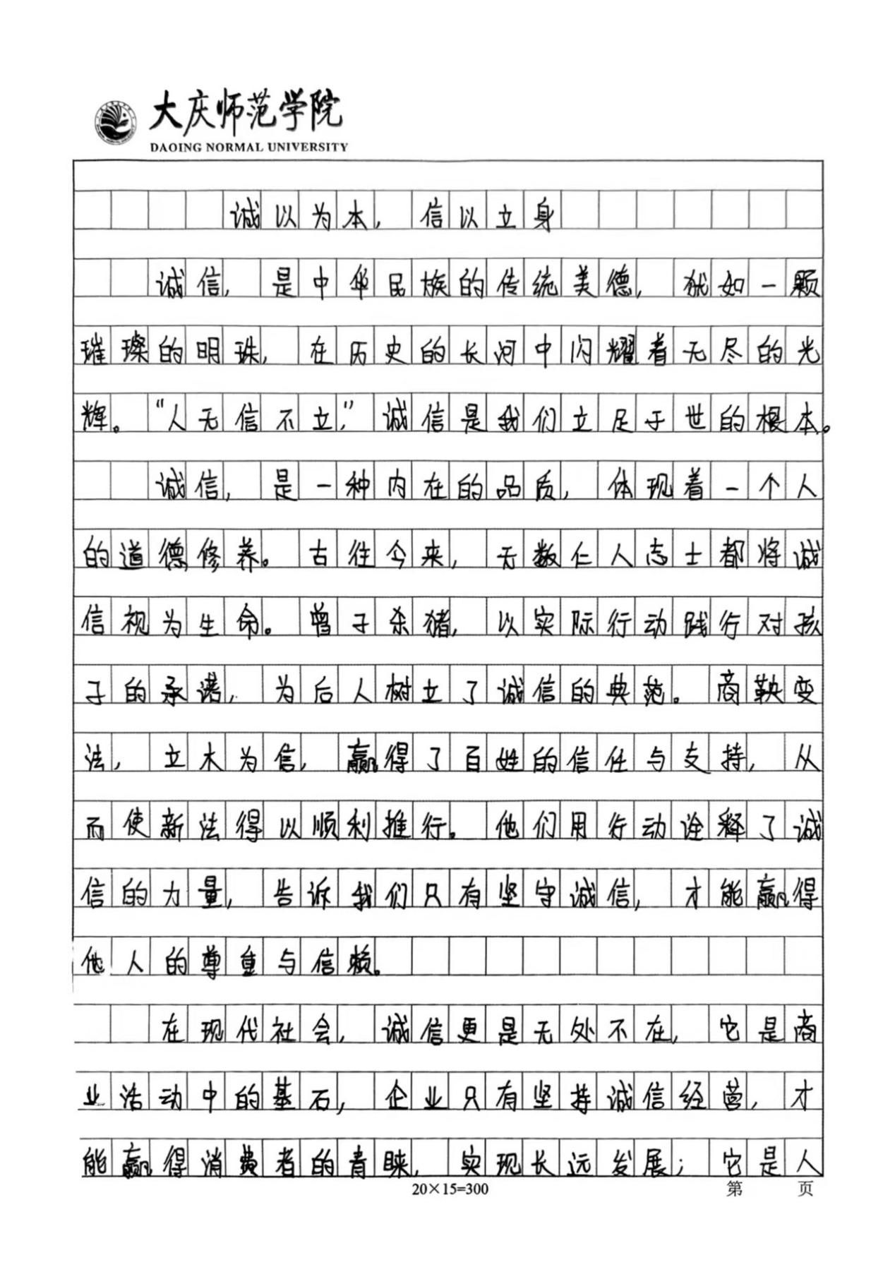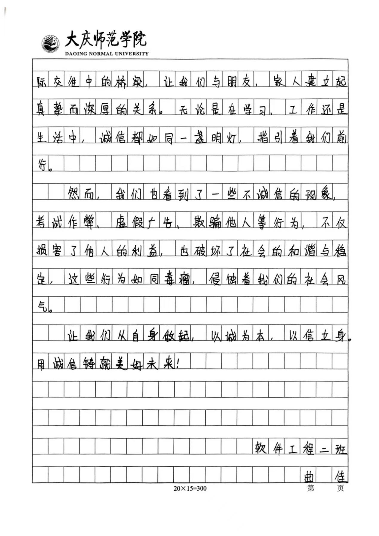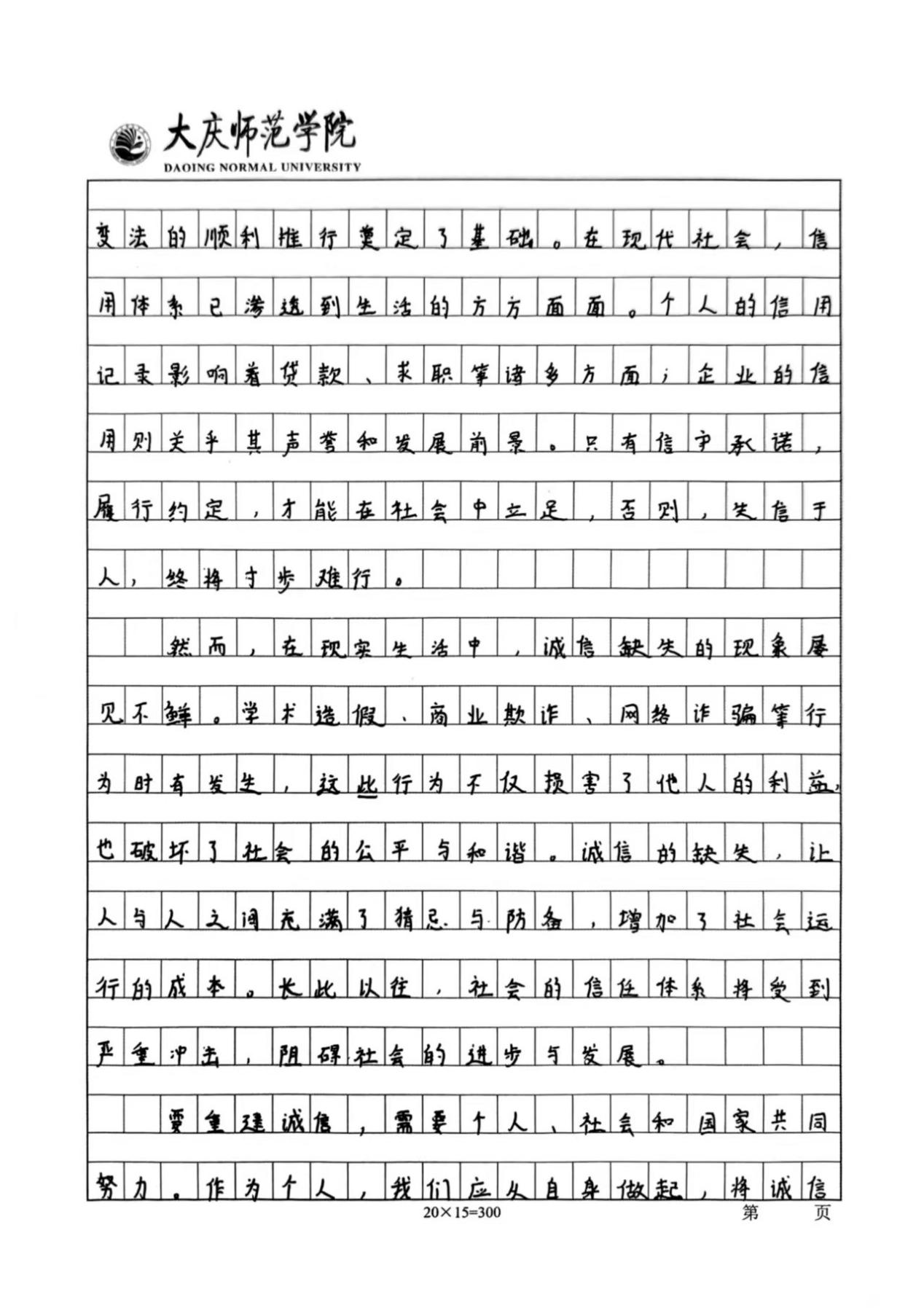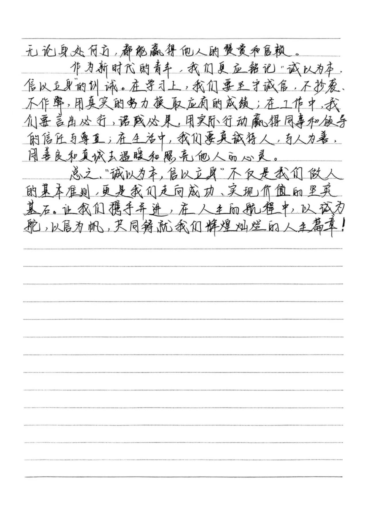 活动开展期间,同学们踊跃报名,积极参与本次活动。他们结合主题内容,用笔墨书写出诚信对于人格塑造的重要性。通过举例论证、引用典故等手法,诠释了诚信的意义,展现了当代大学生对诚信的认知。同时,以本次活动作为载体,传播诚信价值观,营造“人人讲诚信、事事守信用”的浓厚校园氛围,使计科学子在诚信品格的滋养中筑牢人生根基,为构建文明和谐的校园生态注入精神动力。