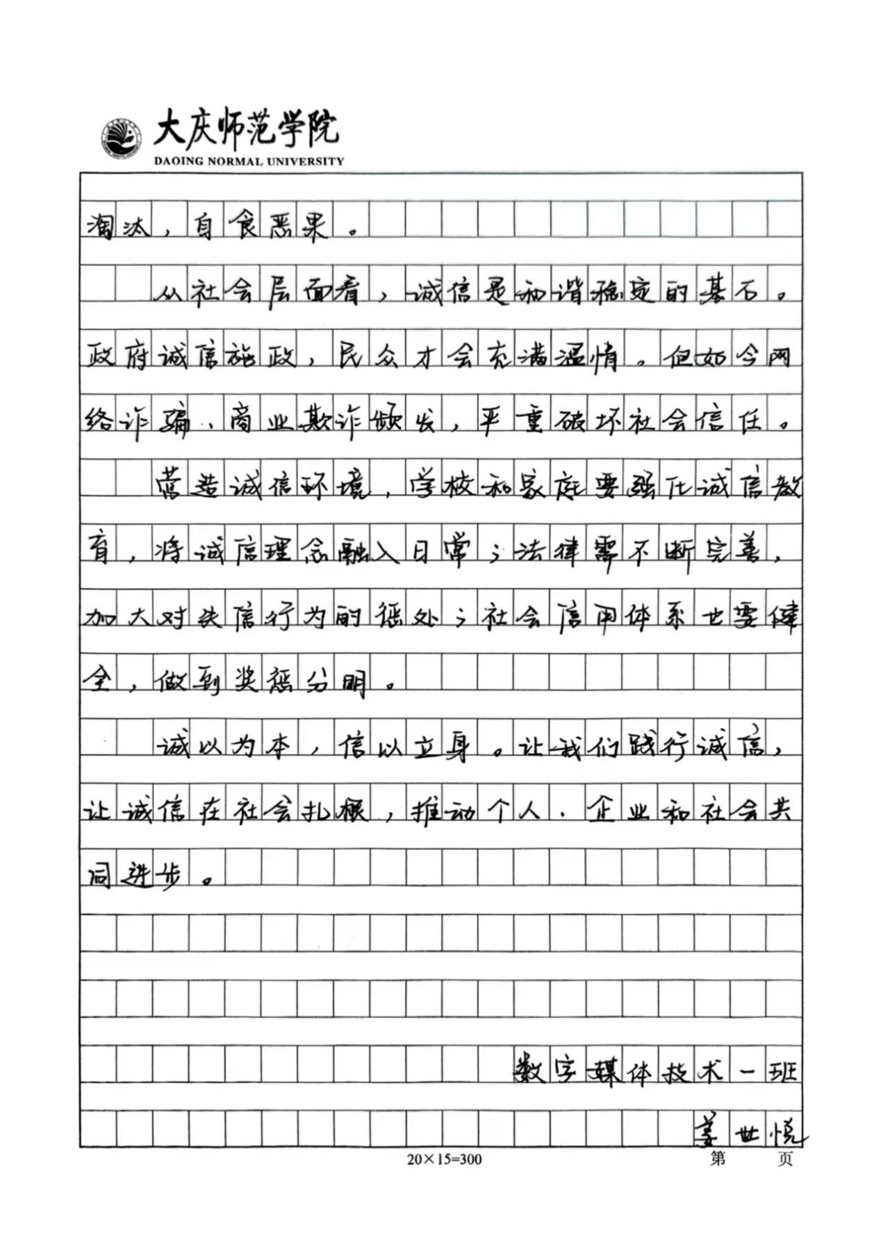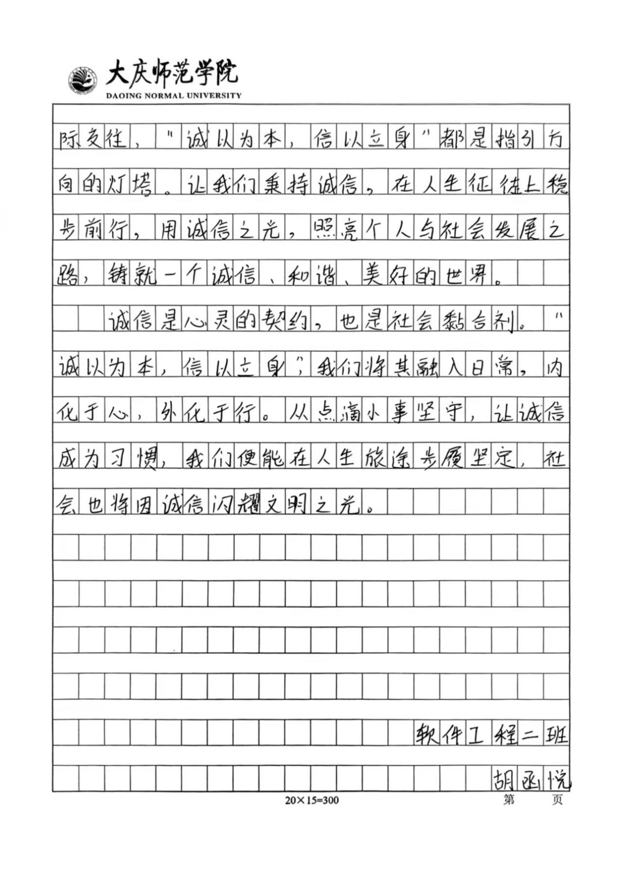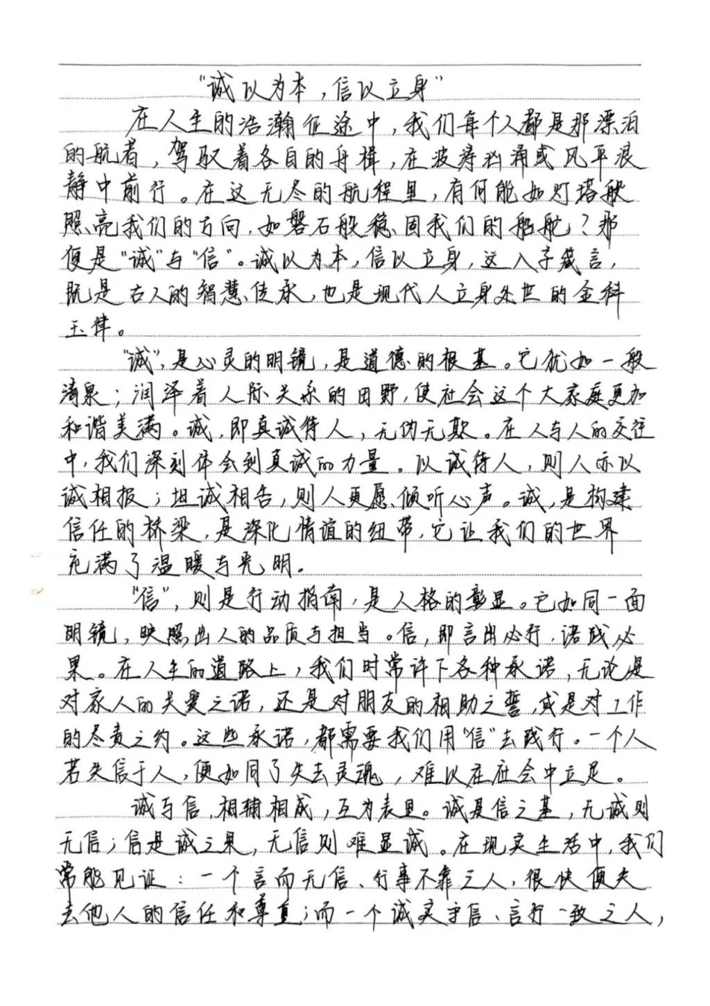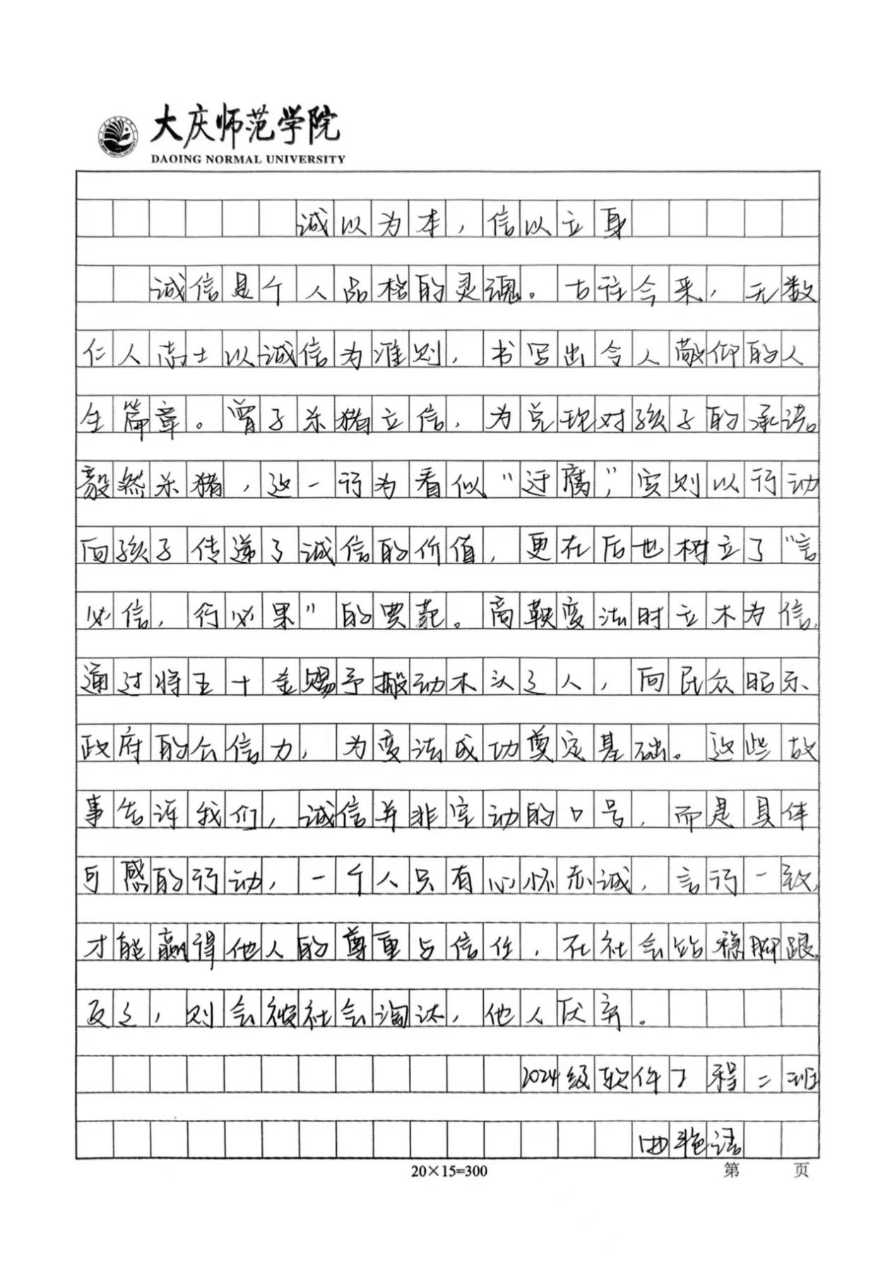 活动开展期间,同学们踊跃报名,积极参与本次活动。他们结合主题内容,用笔墨书写出诚信对于人格塑造的重要性。通过举例论证、引用典故等手法,诠释了诚信的意义,展现了当代大学生对诚信的认知。同时,以本次活动作为载体,传播诚信价值观,营造“人人讲诚信、事事守信用”的浓厚校园氛围,使计科学子在诚信品格的滋养中筑牢人生根基,为构建文明和谐的校园生态注入精神动力。