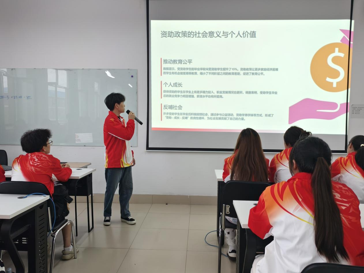 班会中,宣讲人围绕“国家资助政策”、“诚信还款”等主题展开。结合典型案例,深入解读国家助学贷款政策,强调“诚信是立身之本,还款是责任之约”,引导同学们树立契约精神,恪守诚信底线。随后,宣讲人带领大家回顾求学之路,感恩国家资助政策的支持与学校的悉心培养,并号召同学们常怀感恩之心,以实际行动回馈社会信任。