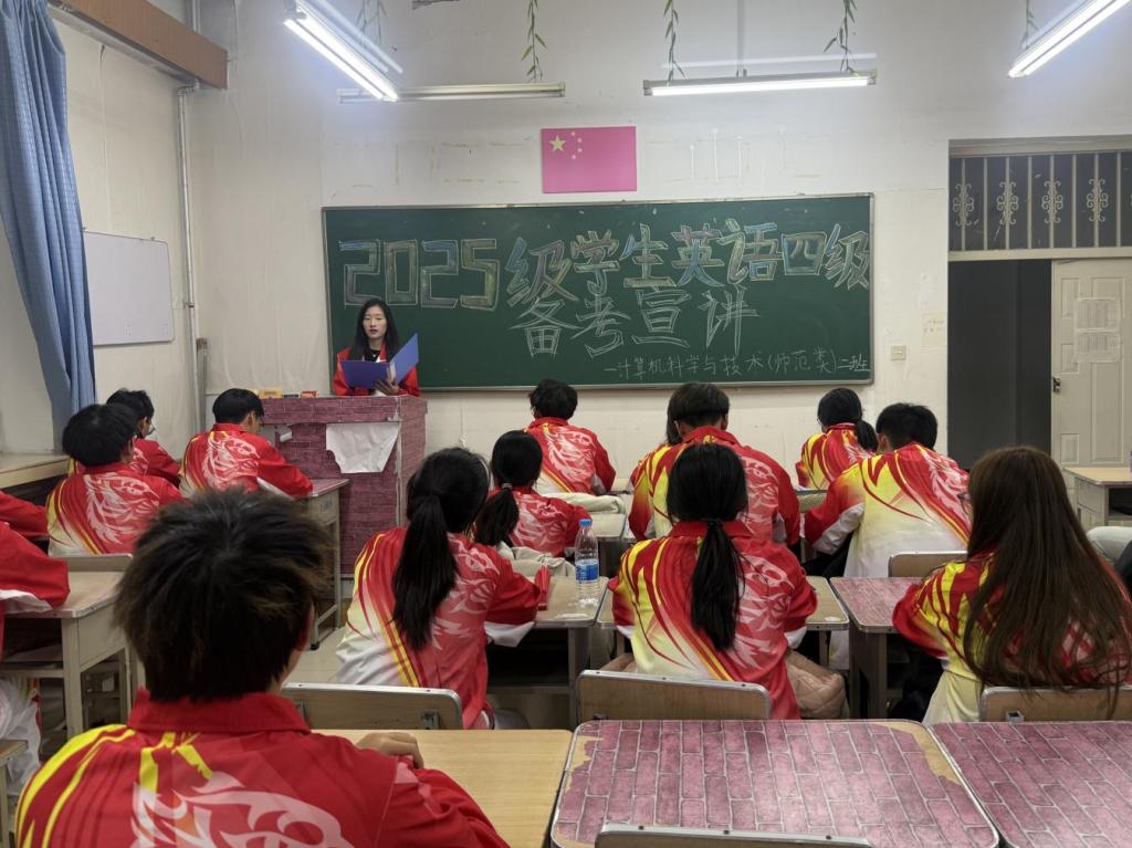 2023级数据科学与大数据技术一班向烨同学从“真题”“词汇”和“技巧”三个核心出发,分享了她的高效备考策略:词汇是英语学习的基础,在听力中应抓住关键信息,在阅读中需学会概括主旨、锁定题眼,而在写作方面则要注重积累实用素材。并鼓励大家通过有针对性的训练,逐步提升综合能力,更加从容地备战四级。