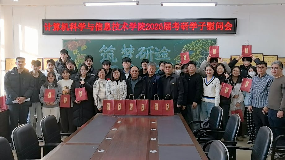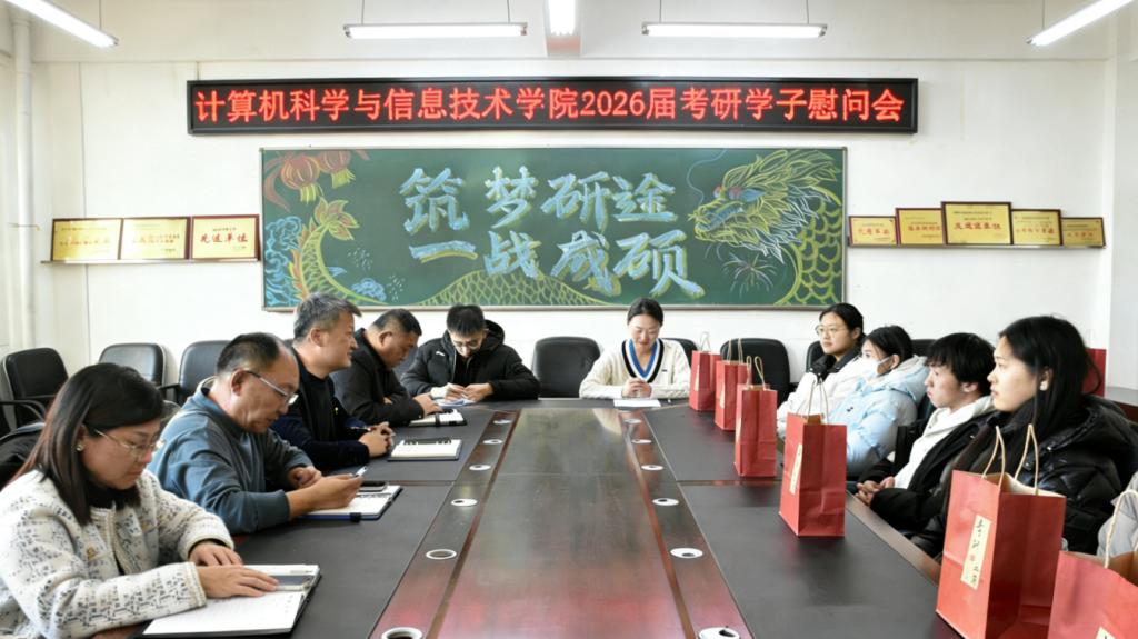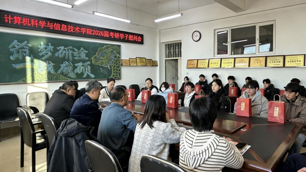 为扎实做好考研学子服务保障与冲刺助力工作,切实传递学院关怀、坚定计科学子备考信心,12月17日,Betway体育西汉姆联召开2026届考研学子慰问会,学院院长王健、党总支副书记刘彰基、副院长贾美娟、副处级辅导员吴鹏、学生工作办公室副主任苏鸿鹏、2026届毕业生辅导员刘烁及各教研室主任为即将奔赴考场的计科学子送上深切厚望与暖心祝福。
