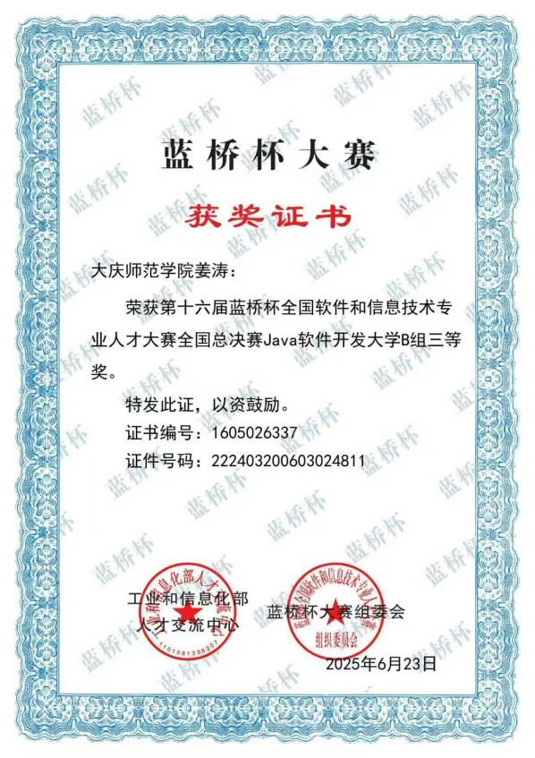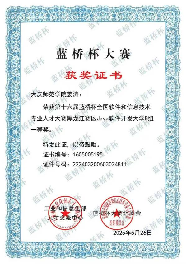 2025年第十六届蓝桥杯全国软件和信息技术专业人才大赛黑龙江赛区Java软件开发大学B组一等奖