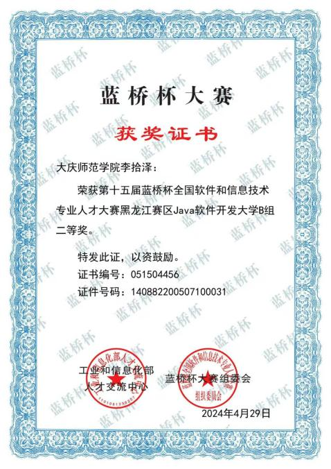 2024年第十五届蓝桥杯全国软件和信息技术专业人才大赛黑龙江赛区Java软件开发大学B组二等奖