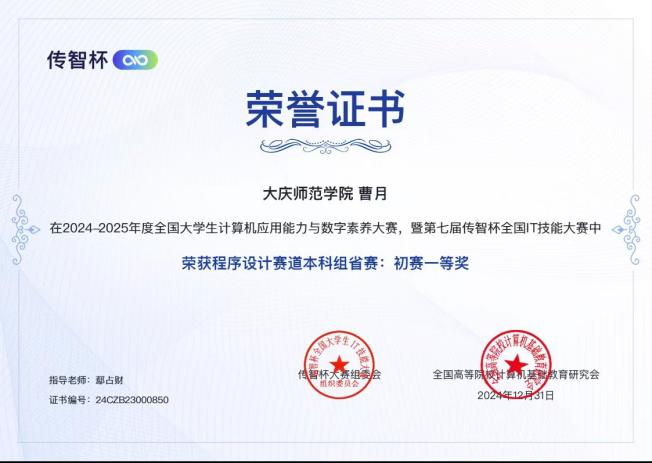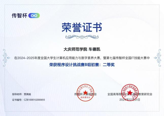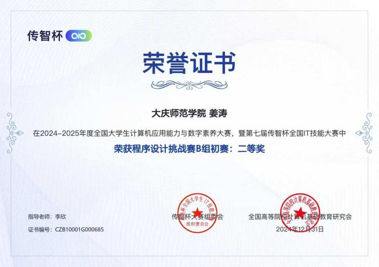 2024-2025年度全国大学生计算机应用能力与数字素养大赛暨第七届传智杯全国IT技能大赛中荣获程序设计挑战赛B组初赛二等奖