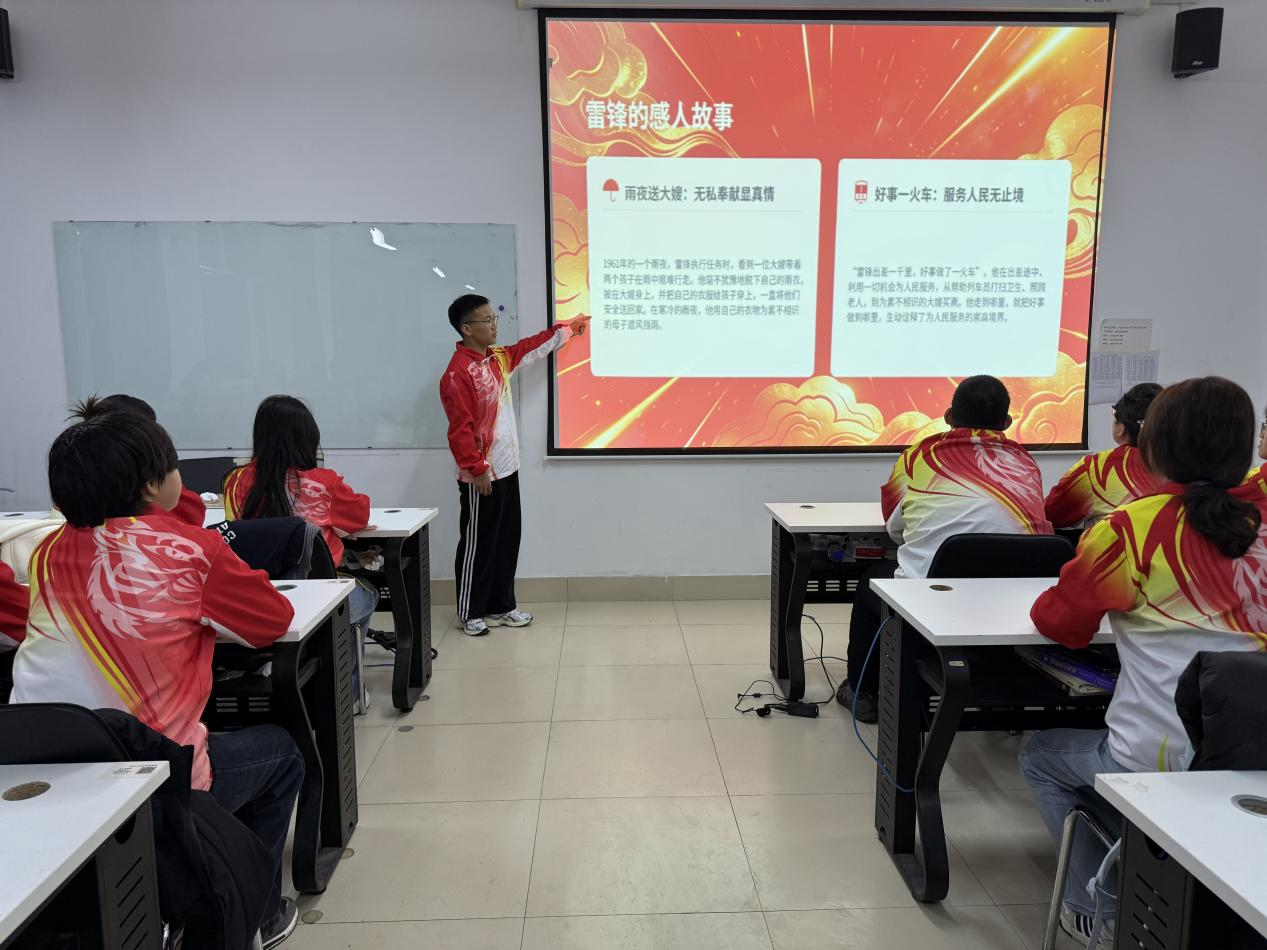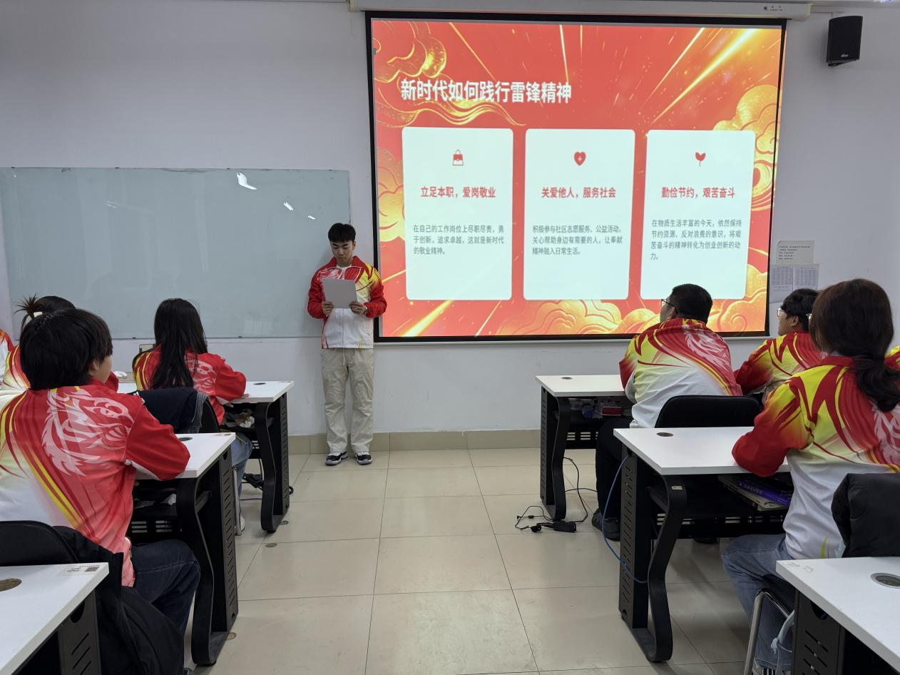 宣讲过程中,宣讲人姜育程围绕“立足本职,爱岗敬业”“关爱他人,服务社会”“勤俭节约,艰苦奋斗”三个维度展开阐述。他结合鲜活事例,深入解读雷锋精神的现实意义,鼓励青年学子在学业中精进笃行、在服务中涵养情怀,以实际行动书写新时代雷锋故事。