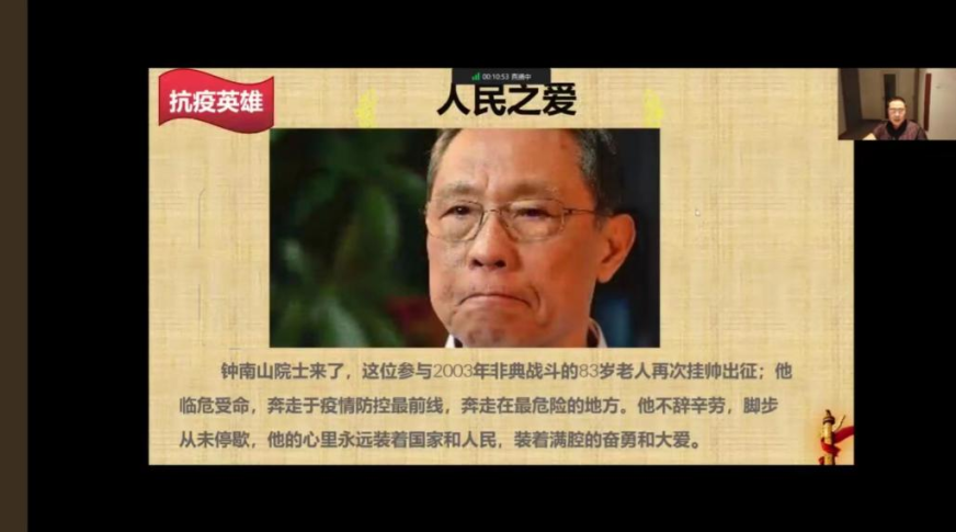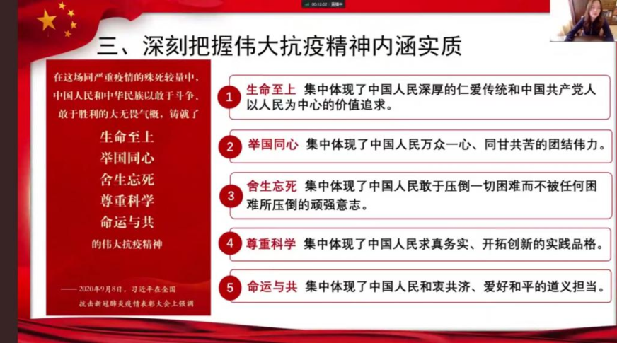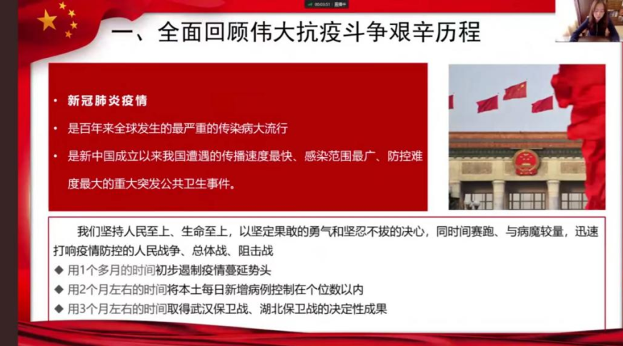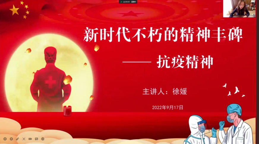 会上,党总支书记徐媛以抗疫精神为主题,用详实的史料、典型的事例,多方位地回顾了伟大抗疫斗争的艰辛历程,充分展现了中国力量、中国精神、中国担当,充分展现了中国共产党的领导、我国社会主义制度的显著优势,充分展现了中华民族的伟大力量。抗击新冠肺炎取得的重大战略成果,极大增强了全党全国各族人民的自信心和自豪感、凝聚力和向心力。天使白、橄榄绿、守护蓝、志愿红,这些奔赴在一线的工作人员将永远是我们心中的英雄。