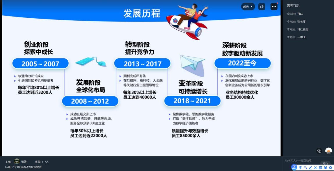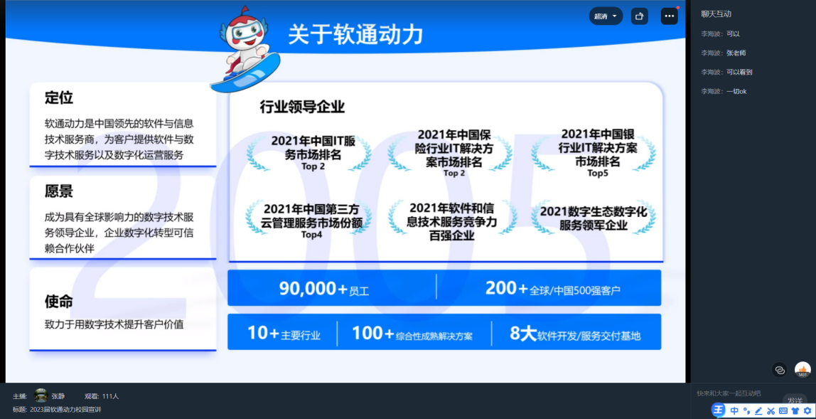 会上,企业宣讲人张老师向同学们展开企业介绍、人才理念、岗位介绍、招聘流程四方面介绍,展示了软通动力注重创新和可持续发展战略的核心价值观,并且将集团所拥有的资质,所获奖项,以及承建的各个项目等企业历史一一向同学们做了详细的介绍。凭借多年积累,软通动力为客户提供IT咨询,业务规划,行业解决方案,定制化开发与实施到系统维护服务的一站式全生命周期,价值链的IT解决方案服务,覆盖银行商,地产等众多行业。