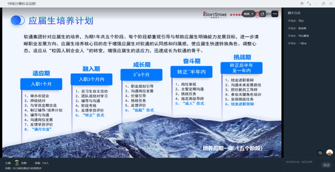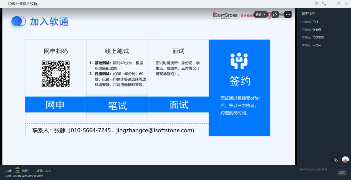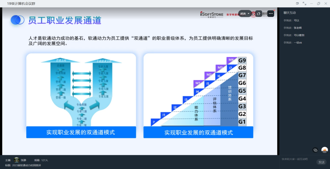 随后张老师以ppt的形式就公司的一些规章制度,福利待遇,企业文化,现有产业结构,组织构架,人力资源政策等几个方面向同学们做了简单介绍,并解答了同学们的疑问。真诚的邀请计科学子加入软通动力集团实现自己的梦想!