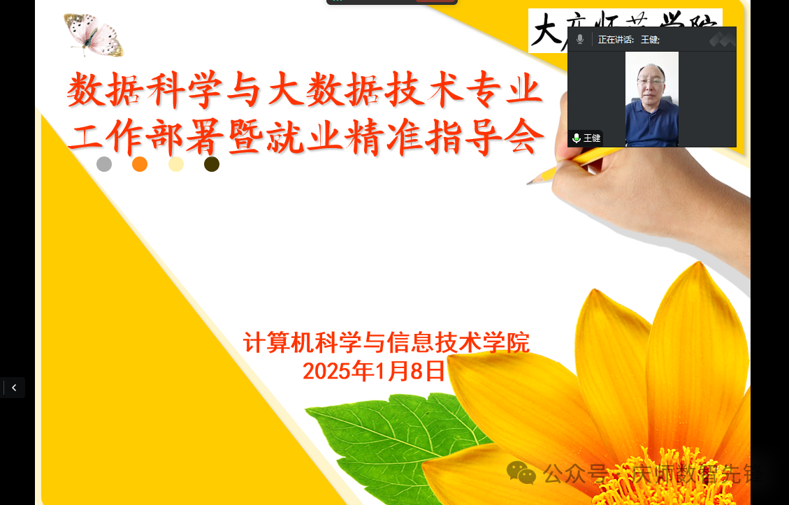 2025年1月8日下午,Betway体育西汉姆联在学习通平台召开2021级数据科学与大数据技术专业毕业工作部署暨就业精准指导工作会议。会议由Betway体育西汉姆联院长、数据科学与大数据技术专业负责人王健教授主持,云计算与数智应用教研室负责人参与,旨在为2021级数据科学与大数据技术专业的全体毕业生提供全面、深入的就业指导和职业规划。