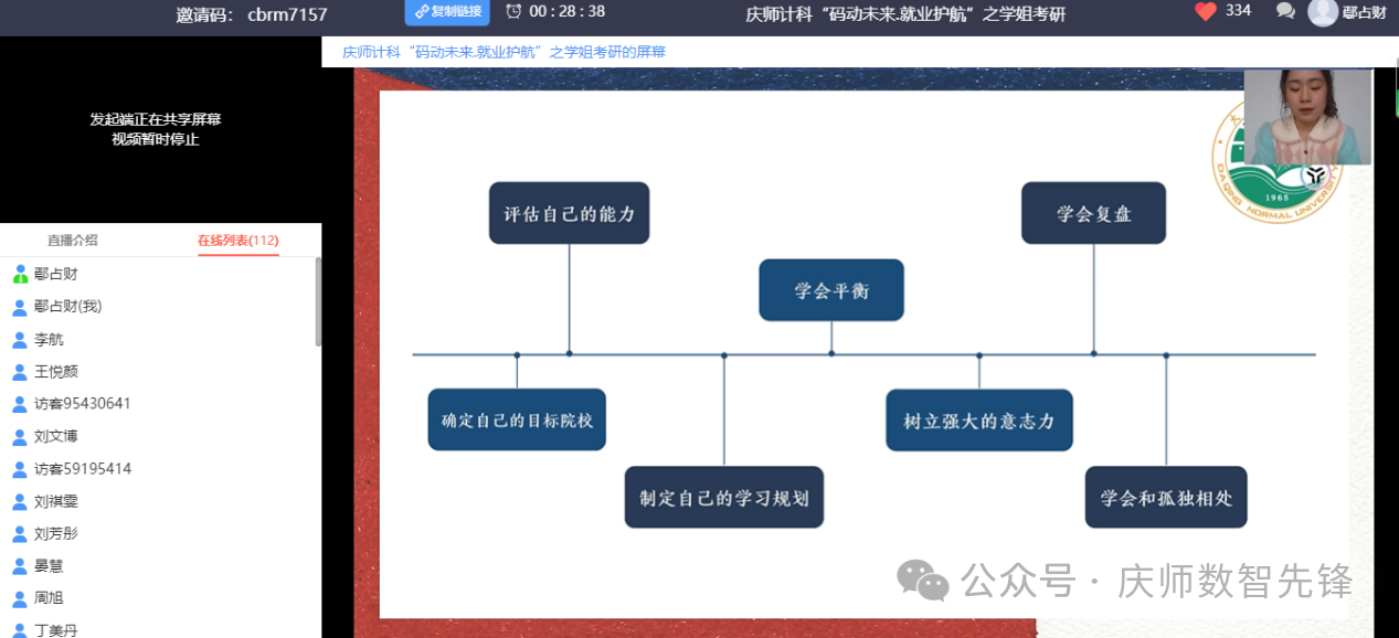 1月21日开展主题为“研途光明:从备考到复试调剂的全程指导”线上分享会。本次分享会邀请我院2024届数据科学与大数据技术专业优秀毕业生国树心同学,目前在安徽工业大学攻读硕士学位。树心同学从自身实际出发,围绕“学海扬帆:学生工作经验分享”、“突围之战:初试成功的策略技巧”、“复试攻略:深度解析之复试秘籍”、“调剂之路:灵活应对的选择艺术”四个方面进行了细致深入的讲解。最后引用“当我们仰望星空的时候,也要踩实脚下的土地,仰望星空是我们捕捉梦想的开始,脚踏实地则是我们让梦想成真的途径。”鼓励同学们既要怀揣梦想,又要脚踏实地,勇敢追求自己的未来。
