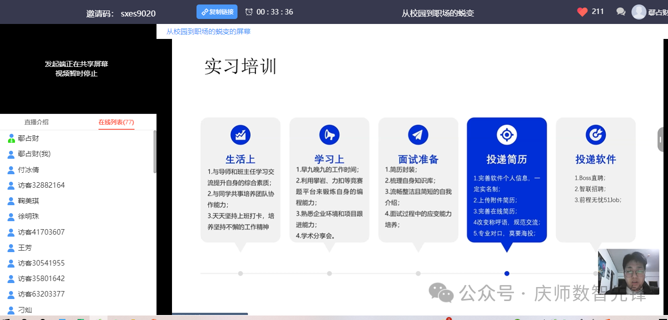 这三次的就业专项分享会累计300余人次参加,会上,同学们踊跃提问,积极与学姐学长进行互动,学长学姐们毫无保留地分享着宝贵的经验与实战的策略,同学们沉浸其中,收获颇丰,不仅拓宽了视野,更对就业市场有了深刻的理解与认识。大家纷纷反馈,这些分享就像一盏盏明灯,照亮了前行的道路,让他们在面对就业挑战时更加从容不迫,信心倍增。