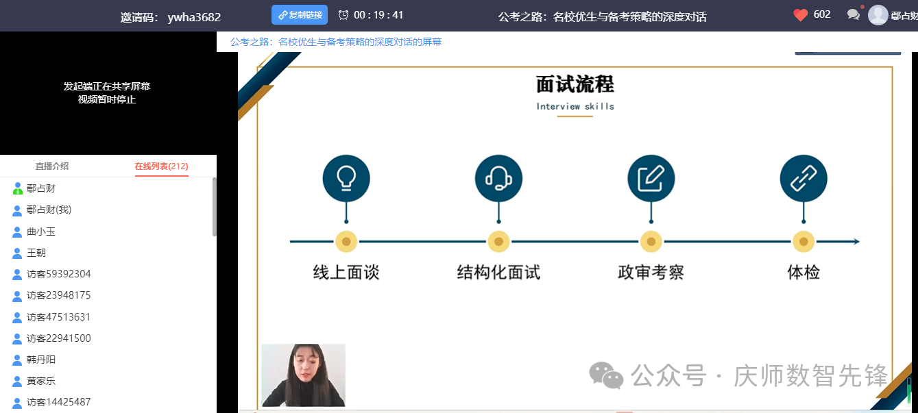 1月19日开展主题“公考之路:名校优生与备考策略的深度对话”线上分享会 ,本次分享会旨在帮助同学们更好地了解公务员考试,掌握备考策略,明确未来规划。主讲人为我院2024届数据科学与大数据技术专业优秀毕业生赵超越,现任职于齐齐哈尔市依安县国家保密局。超越同学结合自身经验和实际情况从备考目标、考试类型、目标职位、学习计划、面试技巧等方面进行了分享。最后,她鼓励同学们要注重平时知识的积累和能力的提升,利用碎片时间学习热点时事、国家政策等,为考试做好充分准备。